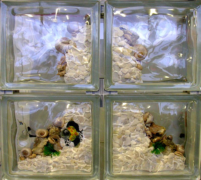 - По дизайну. Нередко стеклянные блоки выполняют с рисунком, скрывая его внутри. Чаще это всевозможные ракушки, камушки, бусины, стразы. В продаже можно найти виды с изображением овощей, фруктов, целых картин.