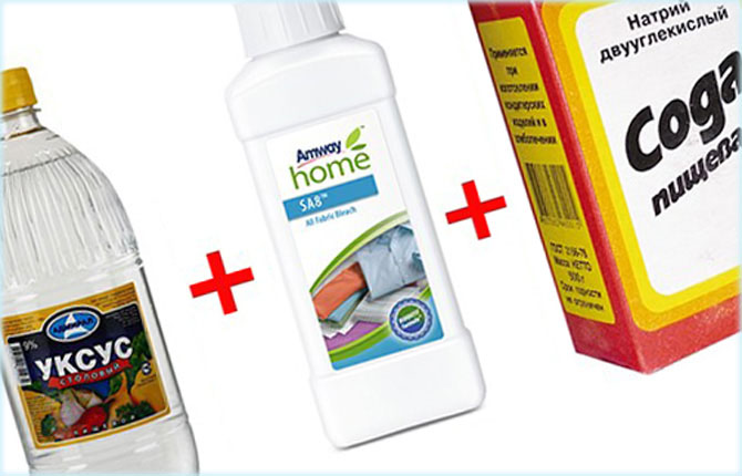- Отдельно соединить столовый 9% уксус и отбеливатель, взятые по половине стакана. Отбеливающее средство заранее приобрести в магазине.