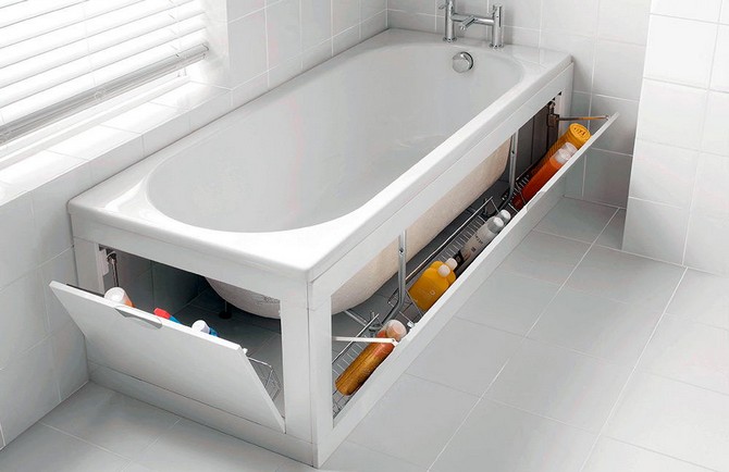 Один из вариантов дизайна предусматривает, что полки будут под ванной. Это актуально, если помещение маленькое и не позволяет расположить вещи в самой ванной комнате.