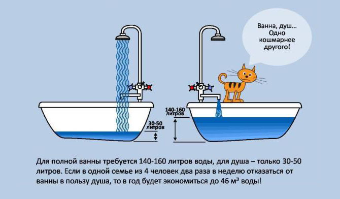 Уменьшение количества принятий ванны поможет сократить финансовые затраты на оплату счетов за коммунальные услуги. При использовании исключительно душа ежегодная экономия достигает показателя в 40 м3.